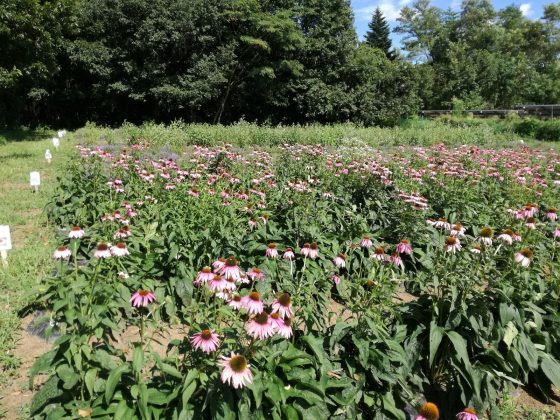今春種まきしたフレッシュなエキナセアは葉が多く、夏の日差をいっぱいに浴びそのエネルギーで一気に開花。満開となった9月12日に収穫を行いました。今回の収穫は「ムラサキバレンギクエキス」として化粧品に配合します。10月には光合成エネルギーをたっぷり蓄えた根っこの収穫を予定。こちらは「エチナシ根エキス」として化粧品に配合してゆきます。