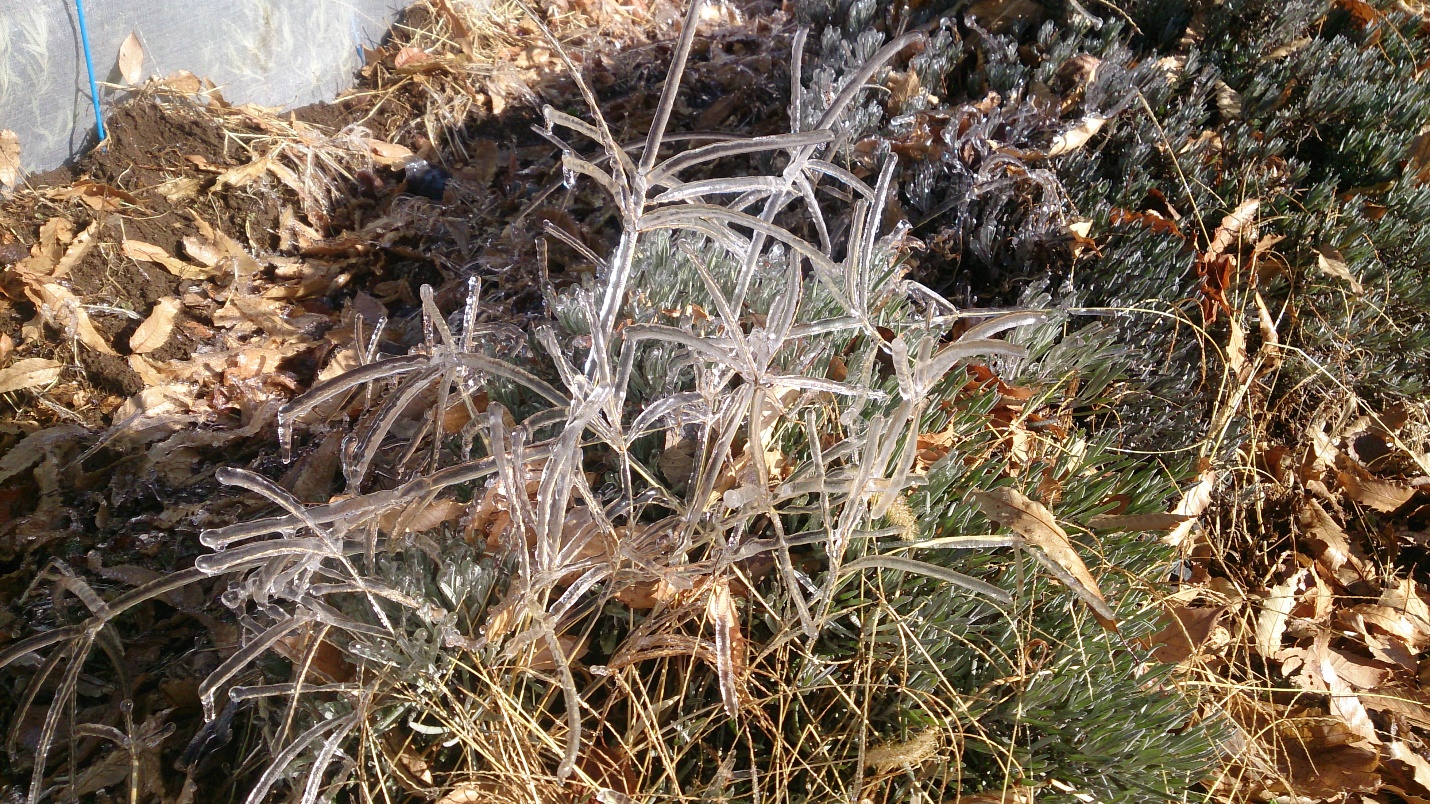 12月12日、今季最強の寒波の到来です。農場へ出向くと、広範囲にわたり立派な霜柱ができていました。