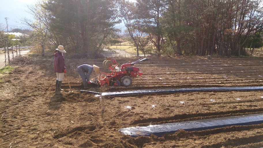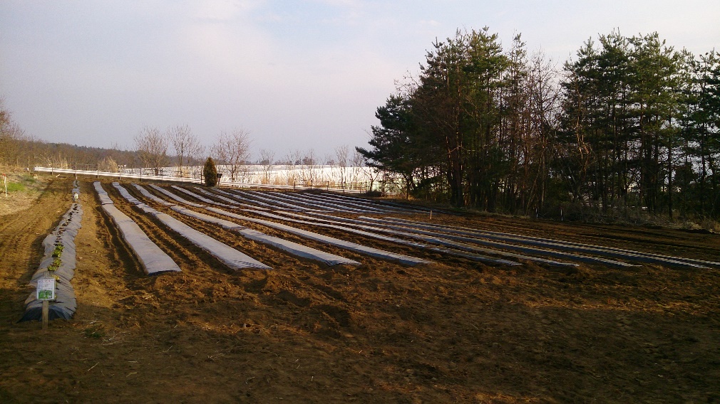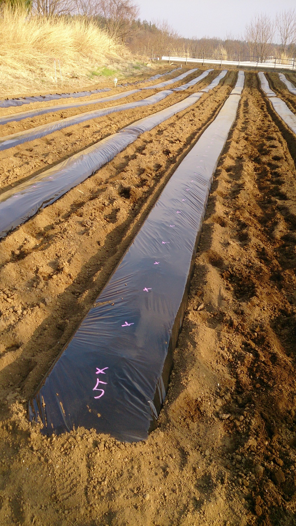 3月27日 。先回までに堆肥散布やpH調整(石灰耕うん)を済ませ、畑土はベストコンディション。