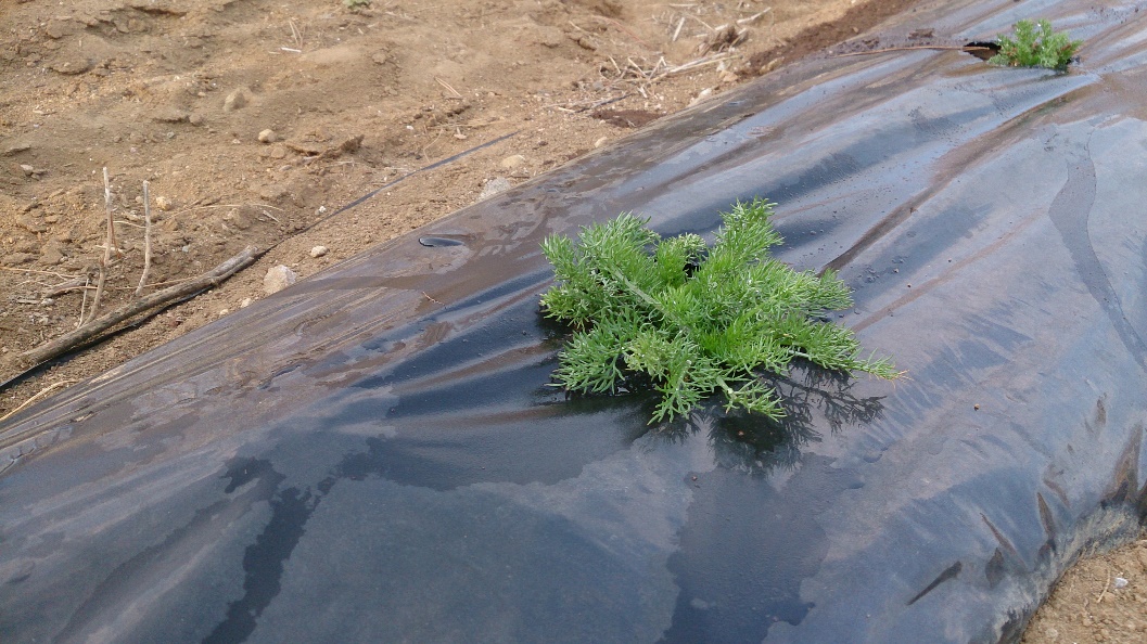 ハーブが大きく育った姿をイメージし畝間(うねま)を設定してマルチ張りを開始。機械を操作していると足下に硬い感覚。ん!? スコップで掘ると60cmを超えるの大きな石が姿を現しました。栽培を開始して9年目になりますが、年々土が柔らかくなるとより深く耕うんできるようになるため今まで届かなかった深さまで耕せるようになるのでこのようなことが毎年のように起こります。結局、男二人がかりで全力除去となりました(汗)。