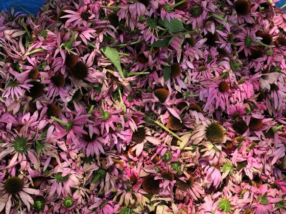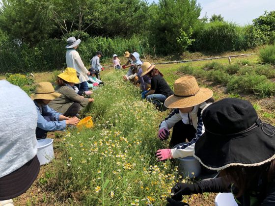 この日の作業は、根っこを大きく肥大させるための「花茎切除(花や茎を刈り取る作業)」を中心にお手伝いいただきました。今年のエキナセアは花数が3~4割ほど多く一面きれいなピンクをしていました。はさみを片手にチョキチョキ、コンテナに集めてゆきます。刈り取られた花は300kg(推定)。これらも無駄にせず乾燥花やテスト、堆肥などすべて有効活用させていただきます。