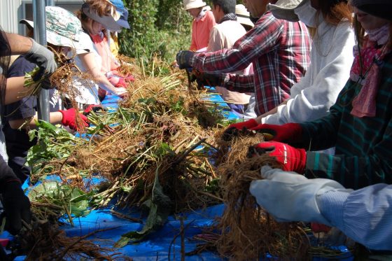 飛び交う赤とんぼに見守られながら農場ではエキナセア根とオウゴン根の収穫を行いました。前日に茎を刈り取った株はスコップを使いみなさんで一気に掘り起こします。
