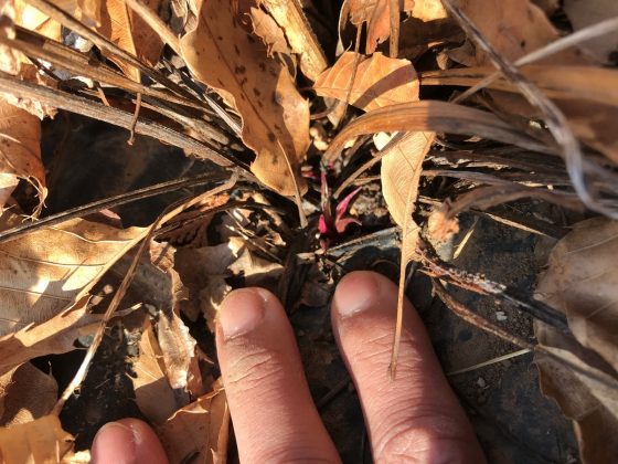 落ち葉の下で春を待つエキナセアの新芽