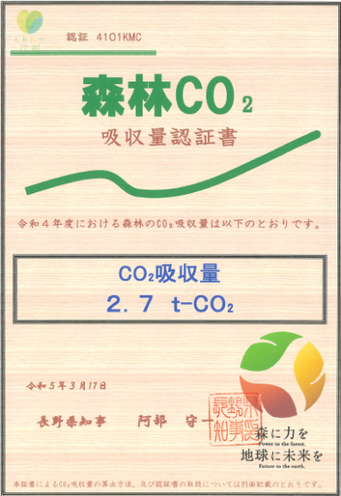 長野県「森林(もり)の里親促進事業」 CO2 吸収評価認証制度により令和3年度分「森林 CO2 吸収量認定書」を取得