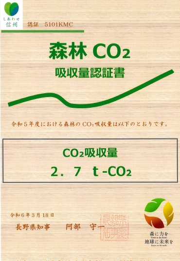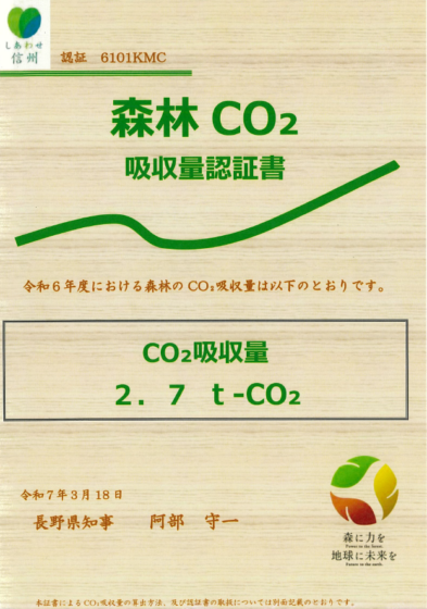 長野県「森林(もり)の里親促進事業」 CO2 吸収評価認証制度により令和6年度分「森林 CO2 吸収量認定書」を取得