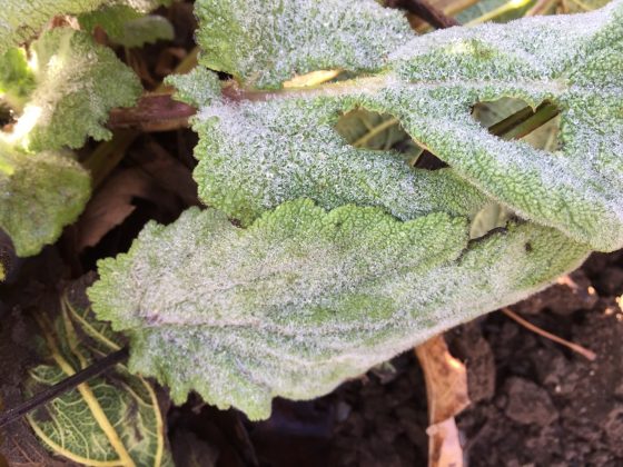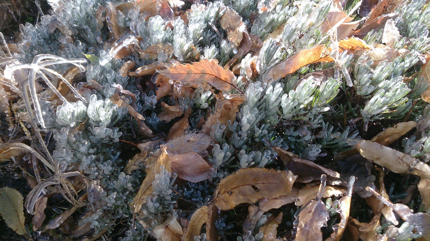 この芸術作品は日中徐々に溶けてゆきましたが、日陰の霜柱は夕刻になってもサクサク音を立てていました。