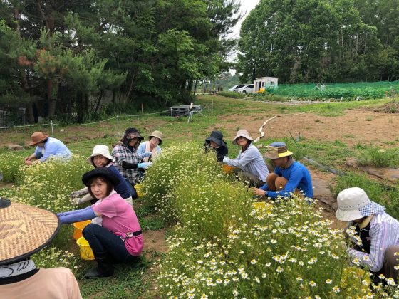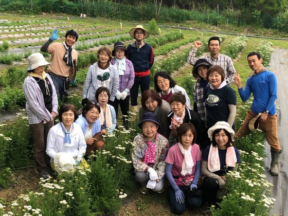収穫ではジャーマンカモミールやローマンカモミール、マロウ(ゼニアオイ)の花摘み、セージ、セイヨウノコギリソウの収穫を行っていただき、栽培調整としてアルテアの間引きなどもお手伝いいただきました。2種類のカモミールはそれぞれの特長や香りの違いなども楽しみながら満開になったお花だけをひとつひとつ手摘みしていただきました。爽やかな青リンゴに似た2種類の香りにみなさん自然と笑顔がこぼれていました。