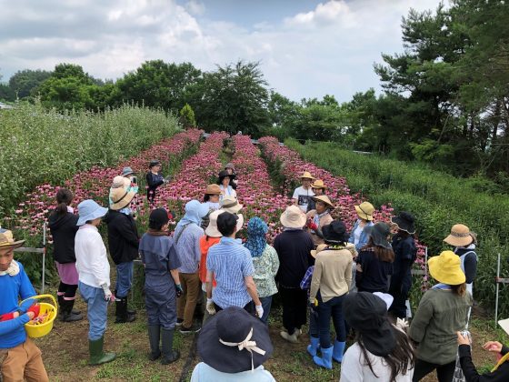 この日の作業は、根っこを大きく肥大させるための「花茎切除(花や茎を刈り取る作業)」を中心にお手伝いいただきました。今年のエキナセアは花数が3~4割ほど多く一面きれいなピンクをしていました。はさみを片手にチョキチョキ、コンテナに集めてゆきます。刈り取られた花は300kg(推定)。これらも無駄にせず乾燥花やテスト、堆肥などすべて有効活用させていただきます。