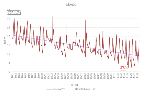 今年の秋はここまで体感的に寒い日がほとんどありませんでしたが11月5日の明野ハーブ農場は最低気温が2℃と、この秋一番の冷え込みで初霜が降りたようです。季節は一気に晩秋へ向かって行きそうです。