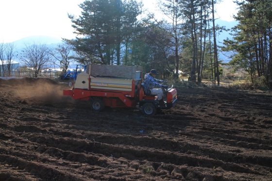 撒き終わったら、土に混ぜ込むためにトラクターで耕します。